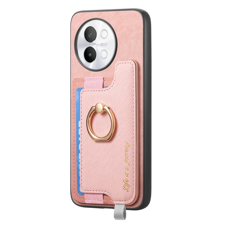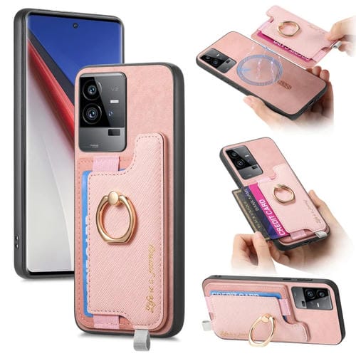 Funda para Teléfono con TaRJetero y Anillo de Cuero con Diseño Retro Magsafe Cross para Vivo Iqoo 11 Pro 5G (Rosa)