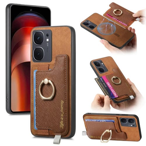 Funda para Teléfono con TaRJetero y Anillo de Cuero con Diseño Retro Magsafe Cross para Vivo Iqoo Neo9/Neo9 Pro 5G (Marrón)
