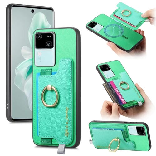 Funda para Teléfono con TaRJetero y Anillo de Cuero con Diseño Retro Magsafe Cross para Vivo S18/S18 Pro 5G (Verde)