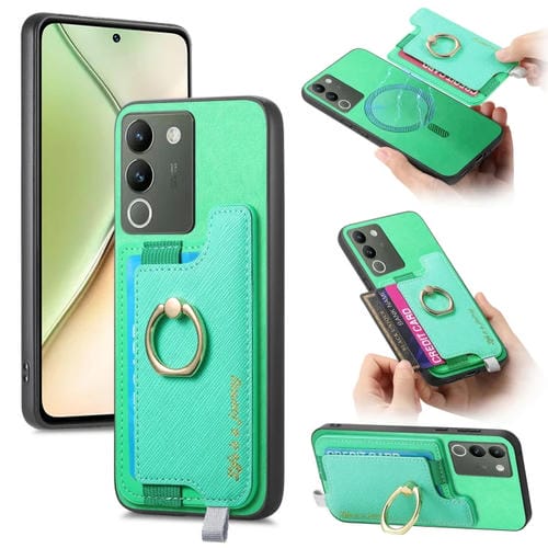 Funda para Teléfono con TaRJetero y Anillo de Cuero con Diseño Retro Magsafe Cross para Vivo Y200/V29E (Verde)
