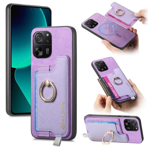 Funda para Teléfono con TaRJetero y Anillo de Cuero con Diseño Retro Magsafe Cross para Xiaomi 13T/13T Pro (Morado)