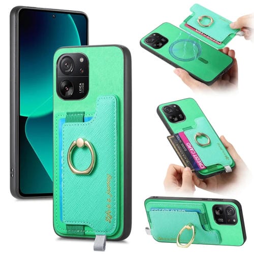 Funda para Teléfono con TaRJetero y Anillo de Cuero con Diseño Retro Magsafe Cross para Xiaomi 13T/13T Pro (Verde)