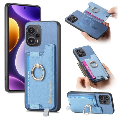 Funda para Teléfono con TaRJetero y Anillo de Cuero con Diseño Retro Magsafe para Redmi Note 12 Turbo/Poco F5 5G (Azul)