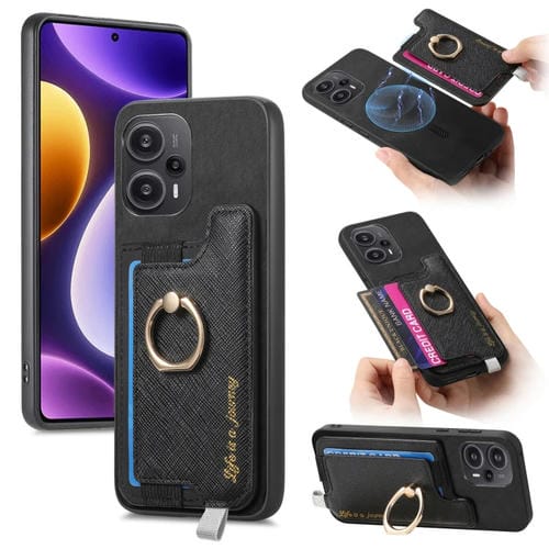 Funda para Teléfono con TaRJetero y Anillo de Cuero con Diseño Retro Magsafe para Redmi Note 12 Turbo/Poco F5 5G (Negro)
