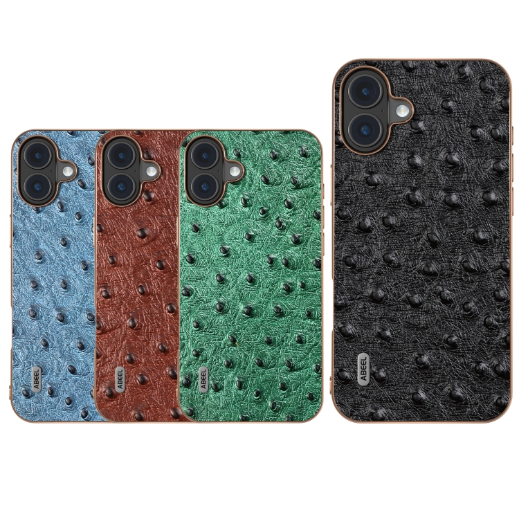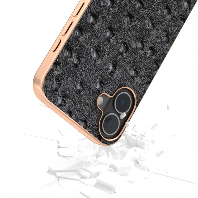 Funda para Teléfono Abeel iPhone 16 Plus Cuero Genuino Textura Avestruz Marco Galvanizado (Negro)