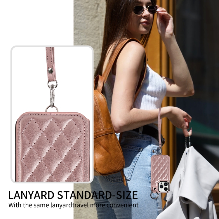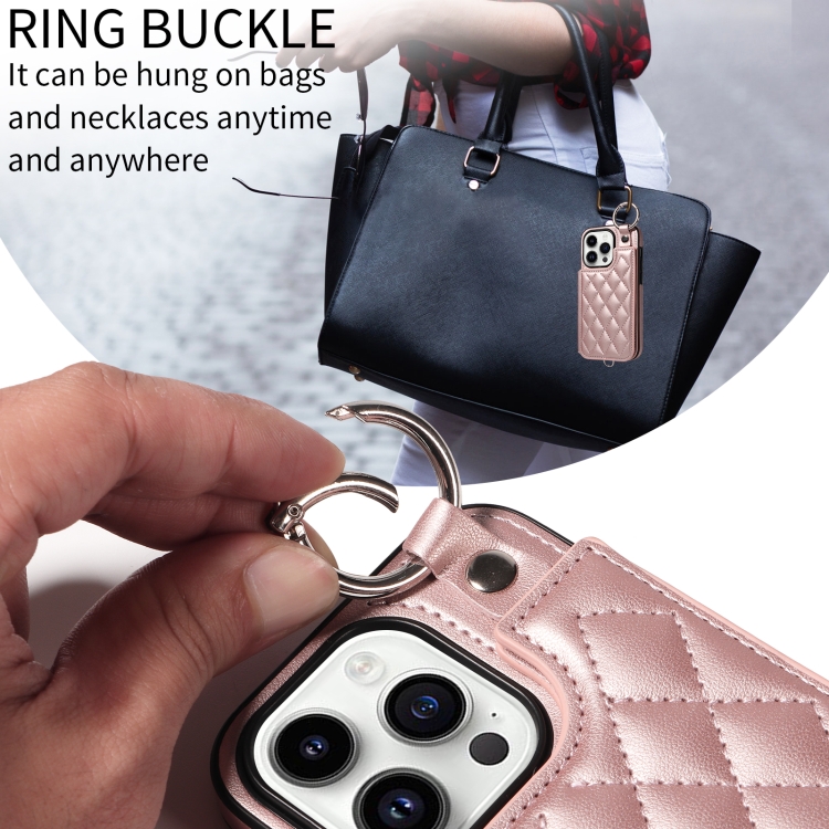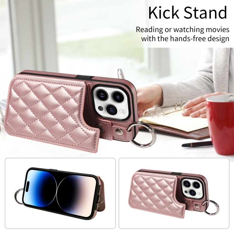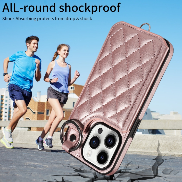 Funda para Teléfono iPhone 14 Pro Textura Rómbica Cordón Corto (Oro Rosa)
