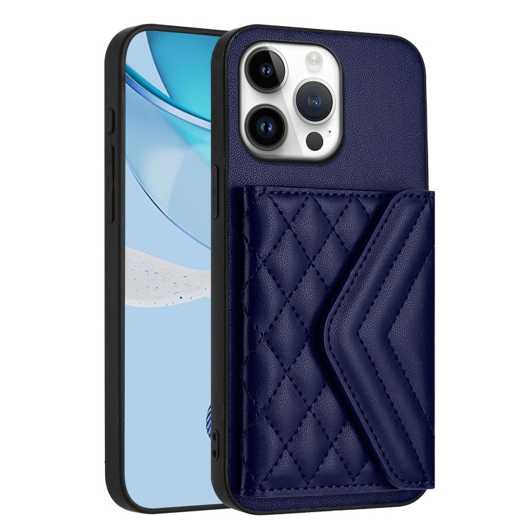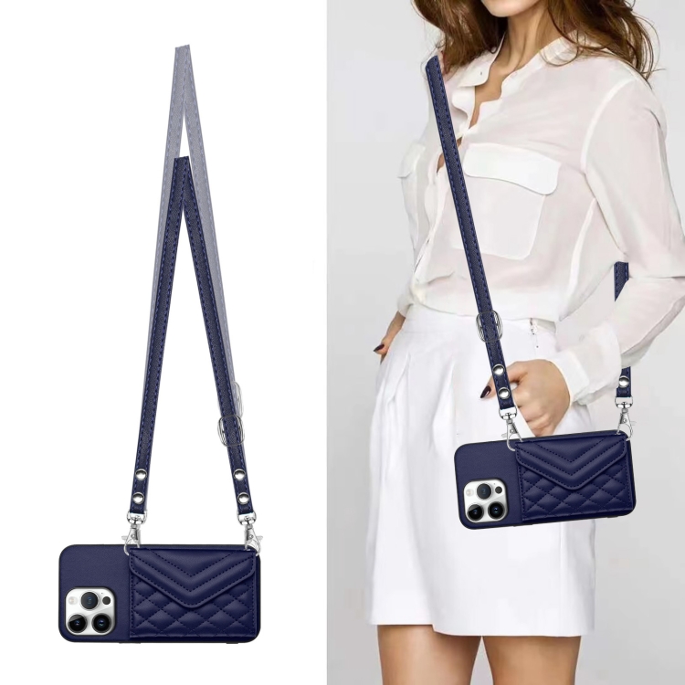 Funda para Teléfono iPhone 16 Pro Max Textura Rómbica Tarjetero Rfid Cordón Largo (Azul)