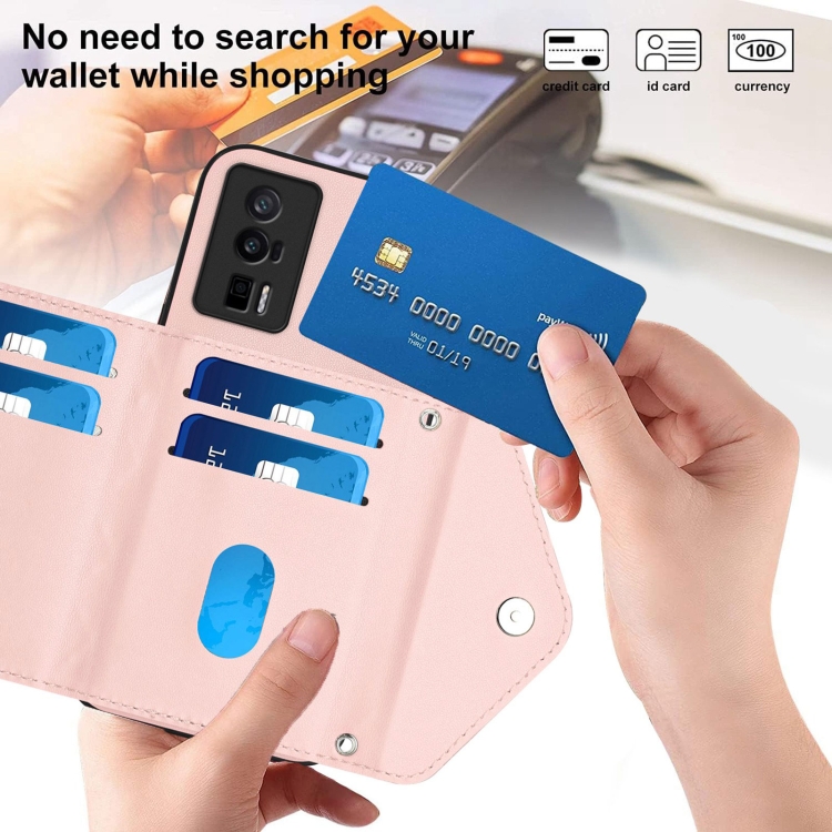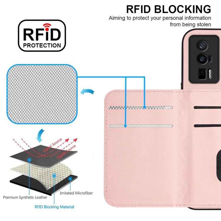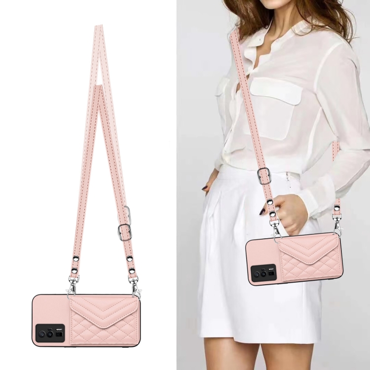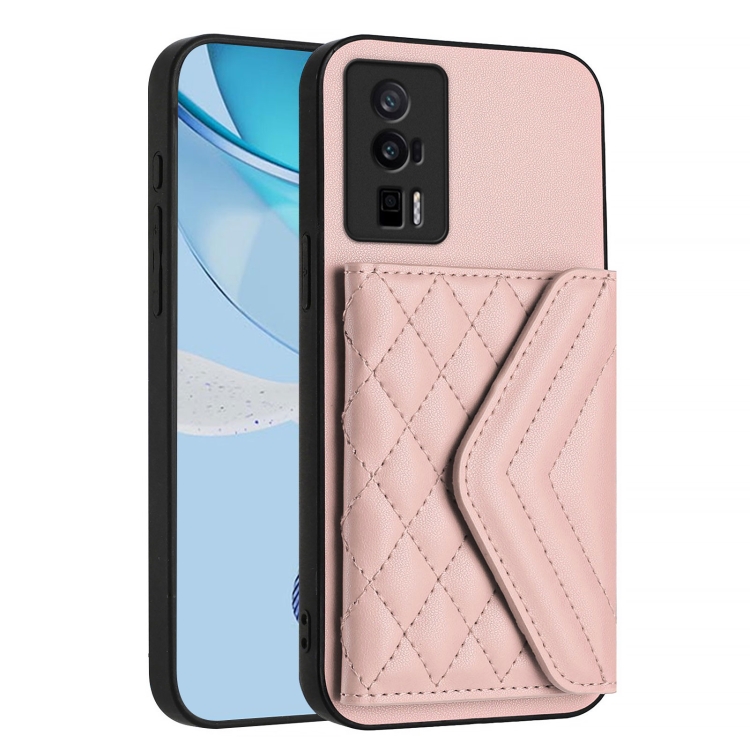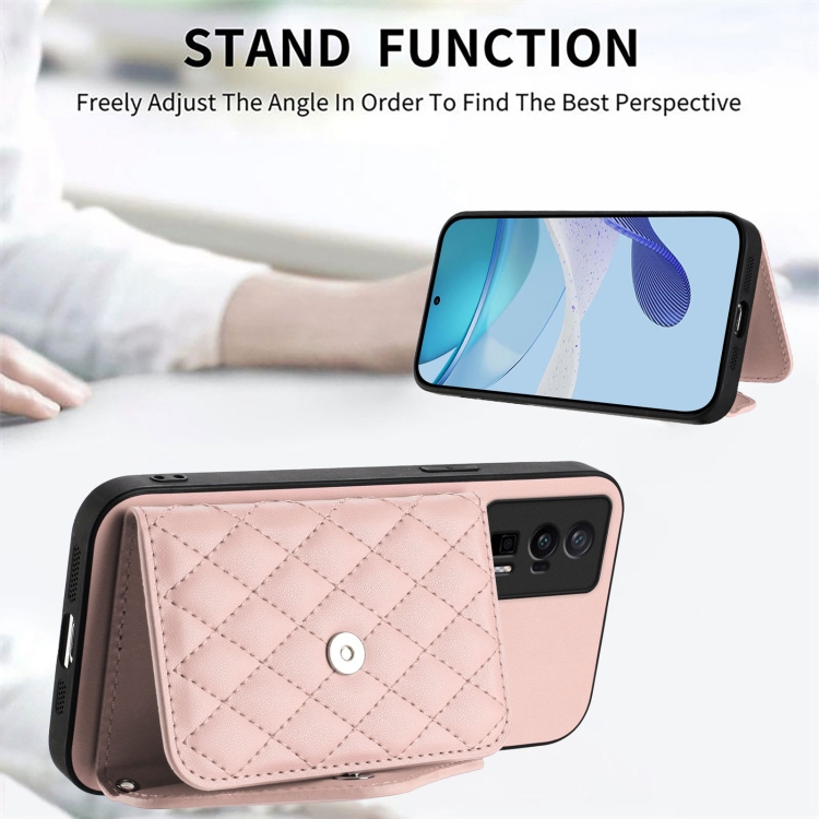 Funda para Teléfono con Textura Rómbica y TaRJetero Rfid para Xiaomi Poco F5 Pro 5G con Cordón Largo (Oro Rosa)