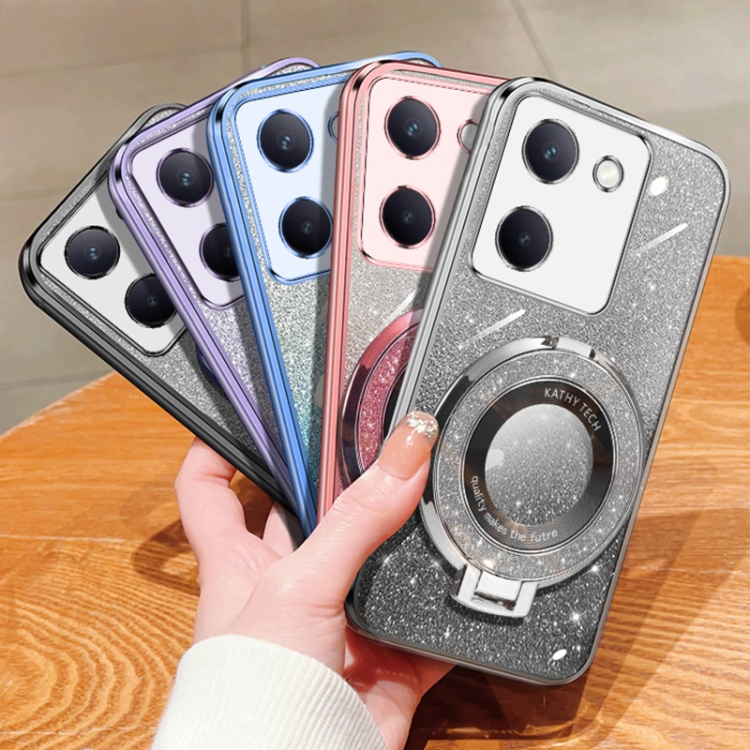 Funda para Teléfono de TPU con Soporte Redondo y Purpurina Degradada Chapada para Vivo Y100 5G (Azul Sierra)