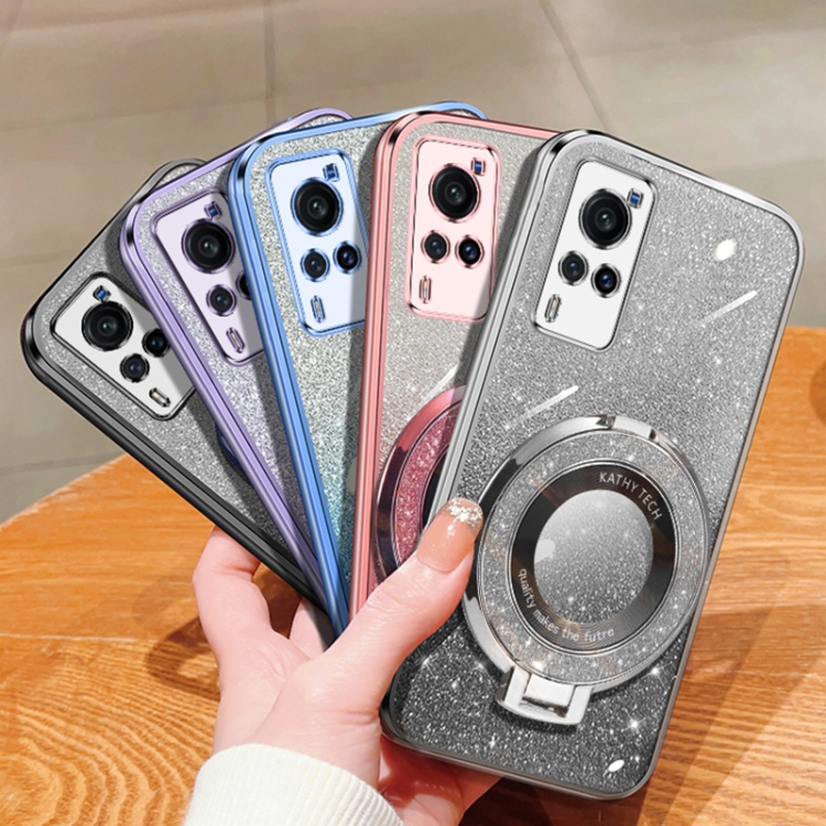 Funda para Teléfono de TPU con Soporte Redondo y Purpurina Degradada Plateada para Vivo X60 (Negra)