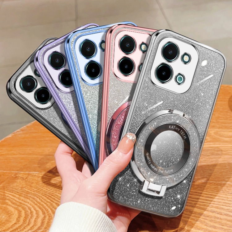 Funda para Teléfono de TPU con Soporte Redondo y Purpurina Degradada Plateada para Vivo Y28 4G (Rosa)