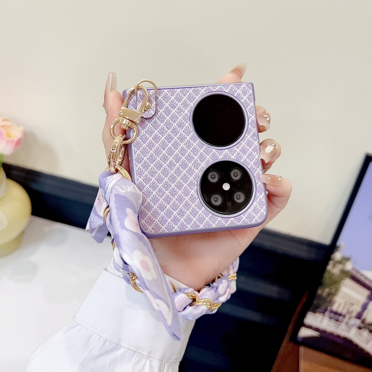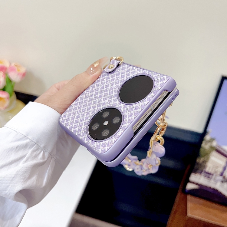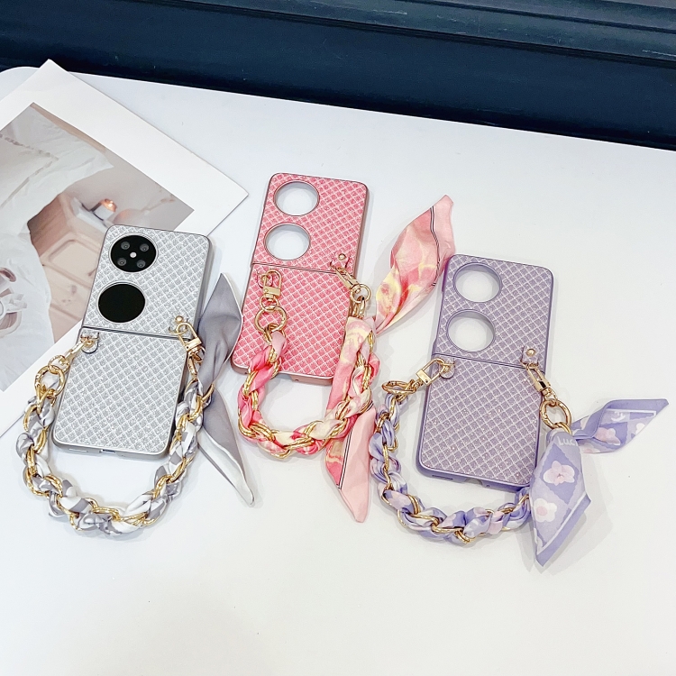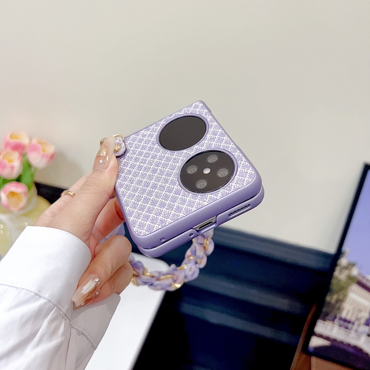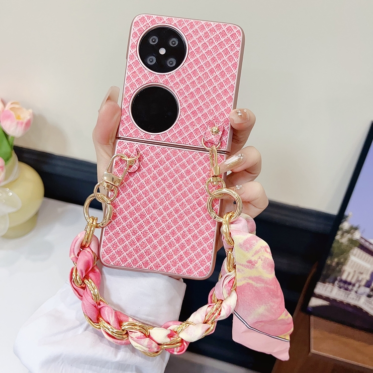 Funda para Teléfono Huawei P50 Pocket con Diamantes y Rombos para PC con Pulsera de Seda (Rosa)