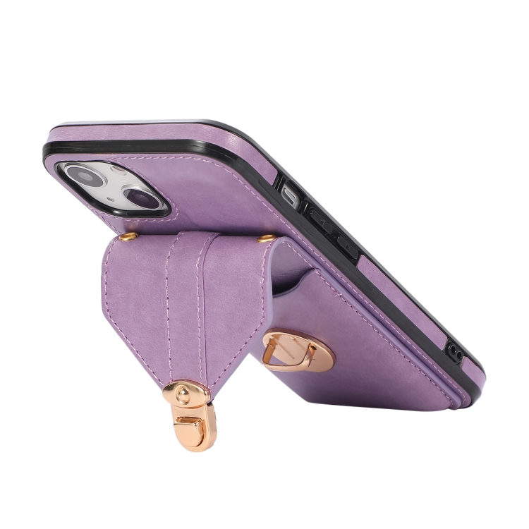 Funda Protectora iPhone 13 Mini con Hebilla Soporte Ranura Tarjeta Billetera Cordón (Púrpura)