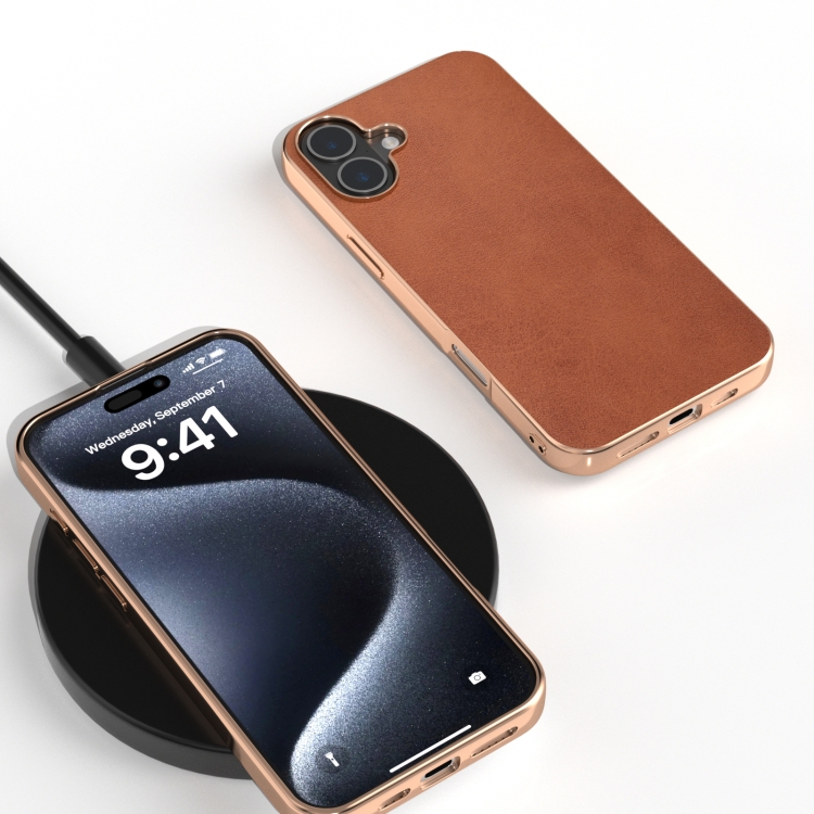 Funda Protectora para Teléfono iPhone 16 Plus Textura Piel de Vaca Nano Galvanoplastia (Marrón)