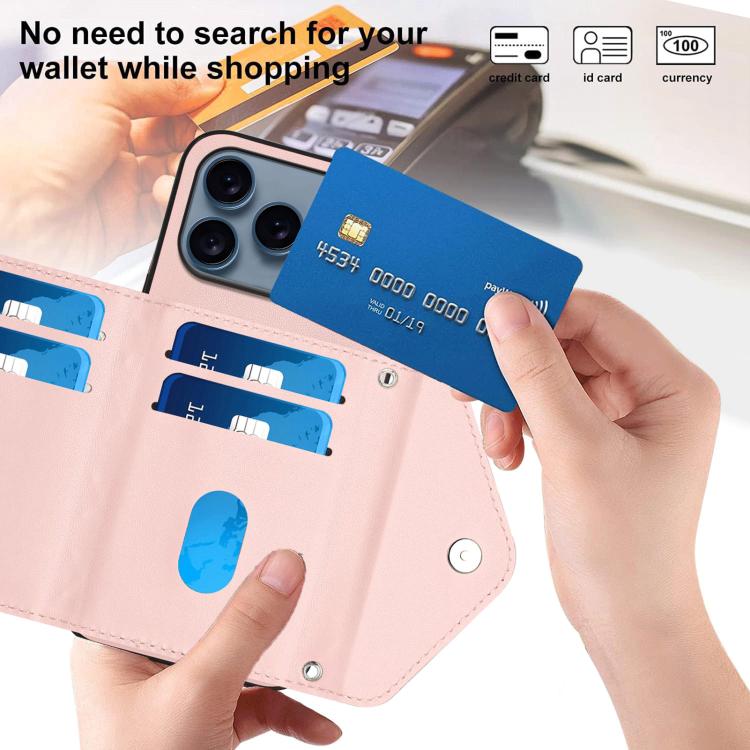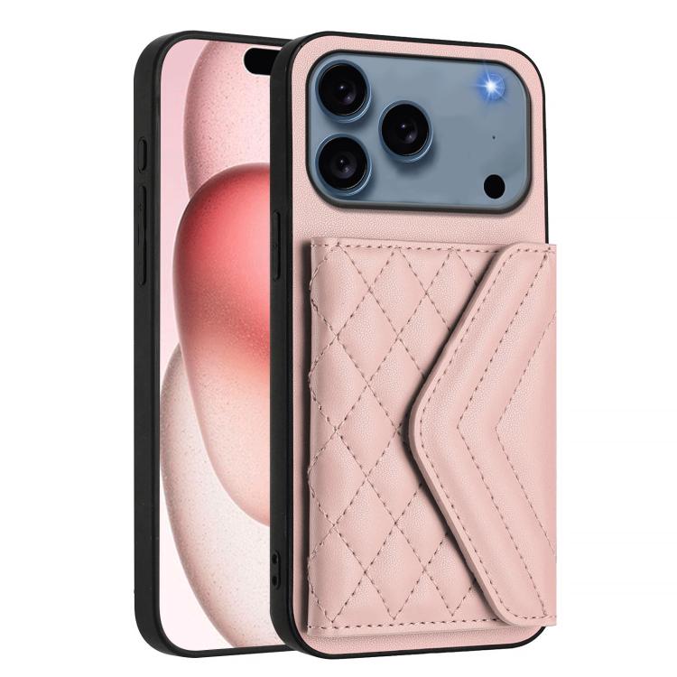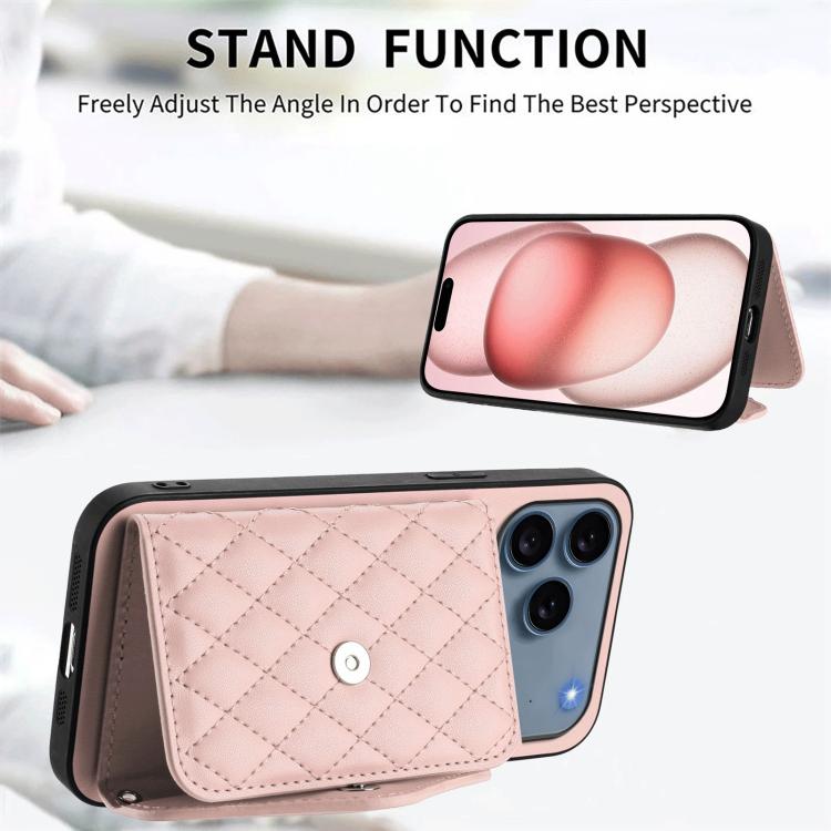 Funda RFID con textura rómbica para iPhone 17 Pro Max con cordón largo (oro rosa)