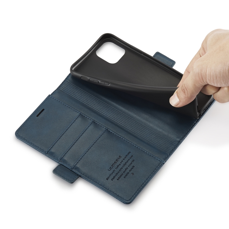 Funda de Cuero Horizontal Flip Lc.Imeeke para iPhone 11 Pro Max con Hebilla Magnética, Soporte, Tragamonedas y Billetera (Azul)