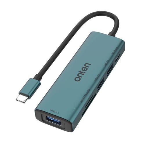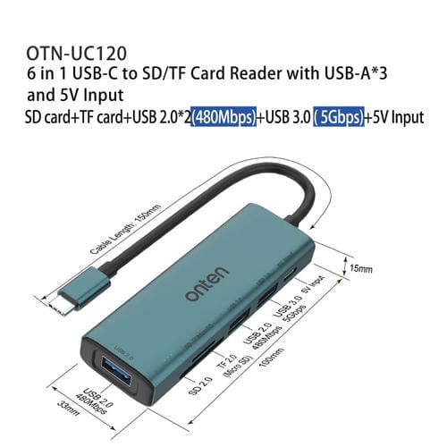 Lector de Tarjetas Onten UC120 6 en 1 USB-C a SD/TF con Hub USB 3 Puertos y Entrada 5 V
