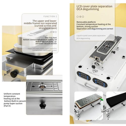La Máquina Inteligente de Desmontaje TBK 258S es un equipo multifunción diseñado para la Reparación avanzada de Teléfonos Móviles, especialmente en la separación y desmontaje de Pantallas con curado UV. Compatible con dispositivos de hasta 7 pulgadas, esta Máquina incorpora una bomba de vacío doble que permite absorber tanto la Cubierta Inferior como la Pantalla del Teléfono, facilitando la extracción de Pantallas planas y curvas. Su función Principal es ofrecer un proceso eficiente y seguro para la eliminación de Adhesivos y pegamentos OCA, así como para la separación de la Placa de Cubierta LCD. Además, cuenta con una caja de curado UV integrada con lámpara de 395 nm para el curado efectivo de Componentes. El equipo incluye un sistema de calentamiento termostático en la parte Inferior y ofrece ajustes multidireccionales, con control de inclinación y rotación de 360°, adaptándose a diferentes modelos y necesidades de Reparación. Está equipado con Enchufe del Reino Unido y es adecuado para Técnicos y usuarios que reparan por cuenta propia con conocimientos Técnicos.