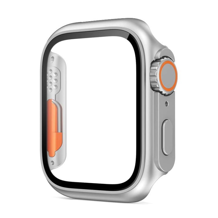 Para Apple Watch Series 9/8/7 de 45 mm xDfind Cambiar a Ultra 49 mm Película de vidrio templado Cubierta de reloj de PC integrada (Plateado + Naranja)