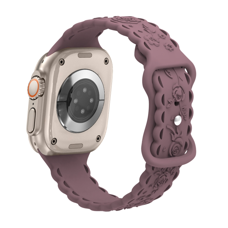 Correa de Silicona para Apple Watch Ultra 49mm con Relieve de Rosa 3D y Encaje (Púrpura Ahumado)