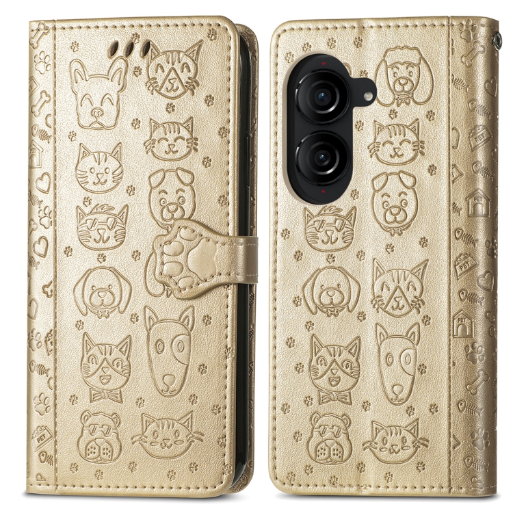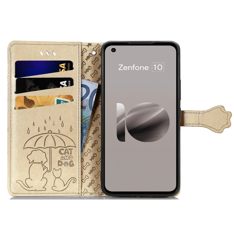 Funda para Asus Zenfone 10 de Cuero con Relieve de Gato y Perro (Dorado)