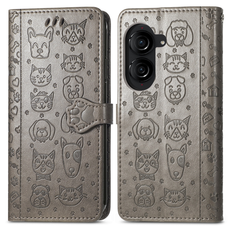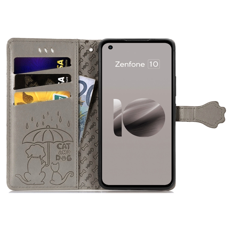 Funda para Asus Zenfone 10 de Cuero con Relieve de Gato y Perro (Gris)