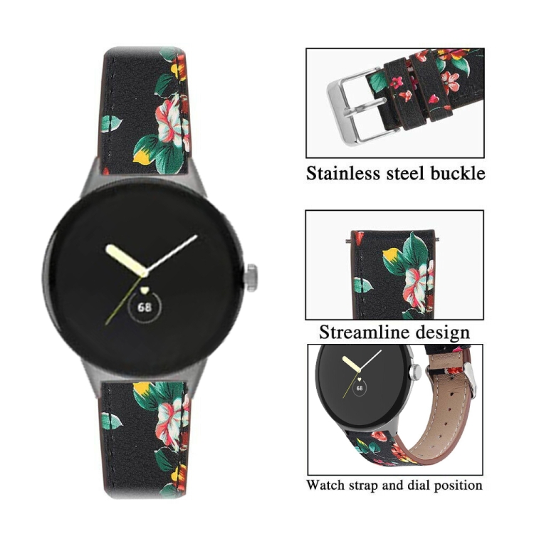 Correa de Reloj para Google Pixel Watch Cuero Genuino Cola Redonda (Flor Roja Negra)