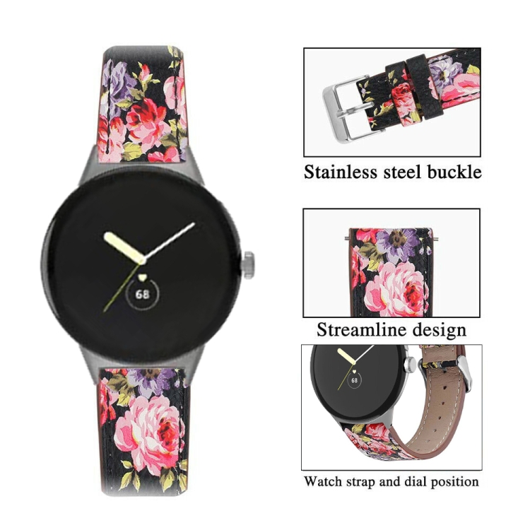 Correa de Reloj para Google Pixel Watch Cuero Genuino Cola Redonda (Flor Rosa Negra)