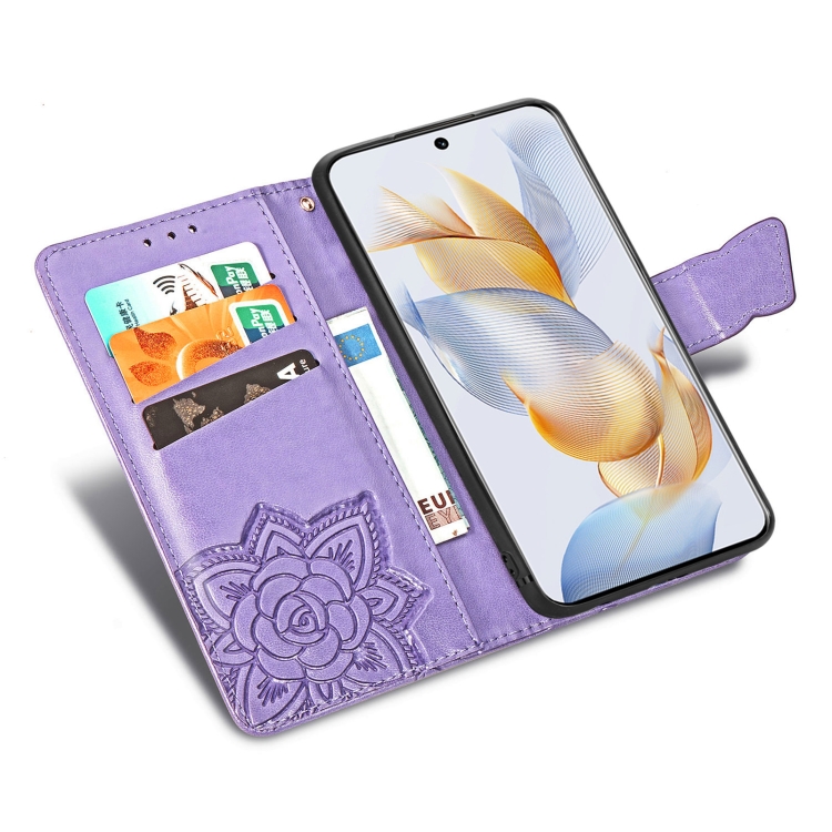 Funda para Honor 100 Pro 5G de Cuero con Relieve Flor de Amor y Mariposa (Lavanda)