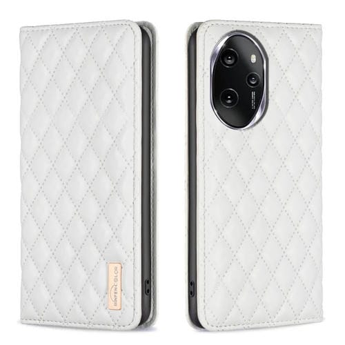Funda para Honor 100 Pro con Tapa de Cuero Magnético y Diseño Diamond Lattice (Blanco)