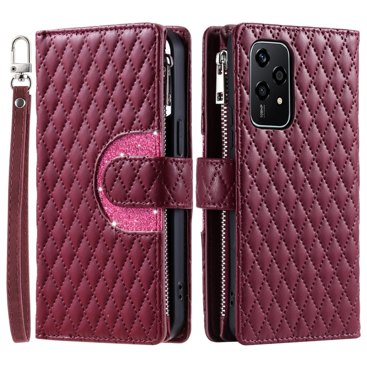 Estuche para Honor 200 Lite de Cuero con Billetera, Cremallera y Celosía con Purpurina (Rojo Vino)