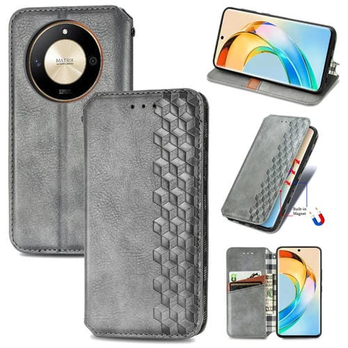 Funda para Honor X50 Cubic Grid de Cuero Magnético Prensado (Gris)