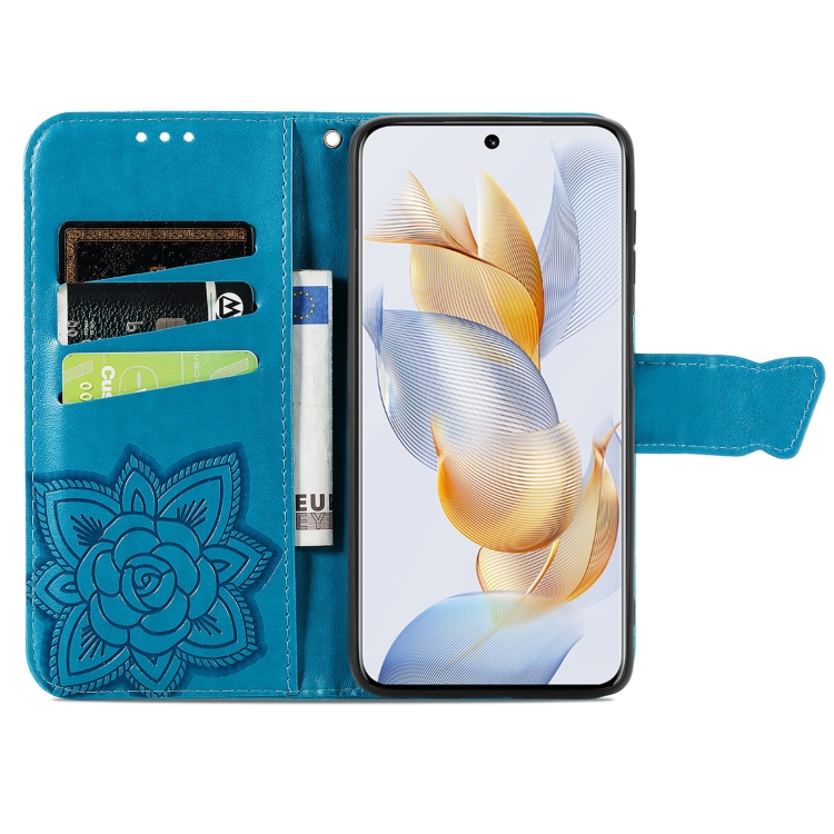 Funda para Honor X6A de Cuero con Relieve Flor de Amor y Mariposa (Azul)