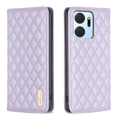 Funda para Honor X7A con Tapa de Cuero Magnético y Diseño Diamond Lattice (Púrpura)
