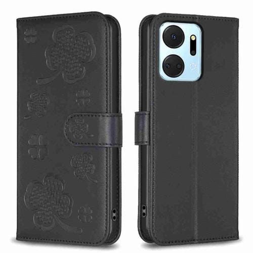 Funda para Honor X7A de Cuero con Relieve de Cuatro Hojas (Negro)