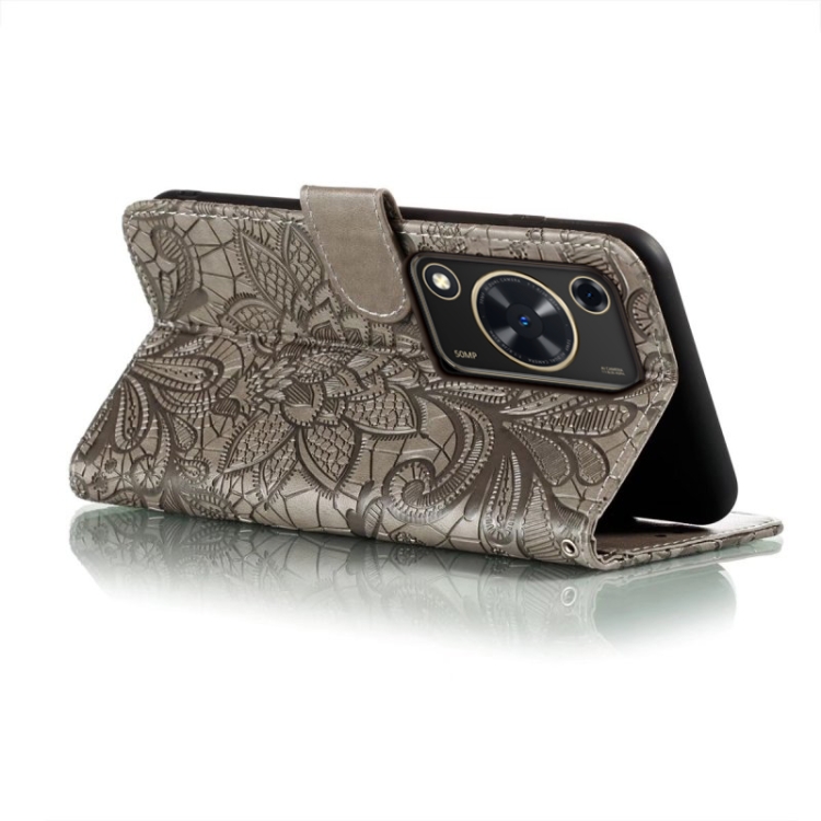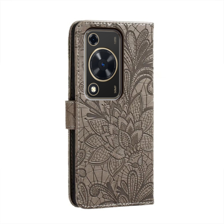 Funda de Cuero para Huawei Enjoy 70 con Tapa y Estampado de Flores de Encaje (Gris)