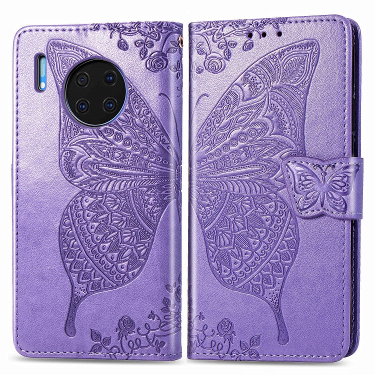 Funda de Cuero Huawei Mate 30 Pro Butterfly Love Flower con Tapa Horizontal, Soporte, Ranura para Tarjeta y Cordón (Violeta Claro)