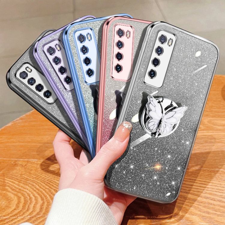 - 1x Funda para Huawei Nova 7 de TPU con Soporte de Mariposa y Brillo Degradado (Plata)