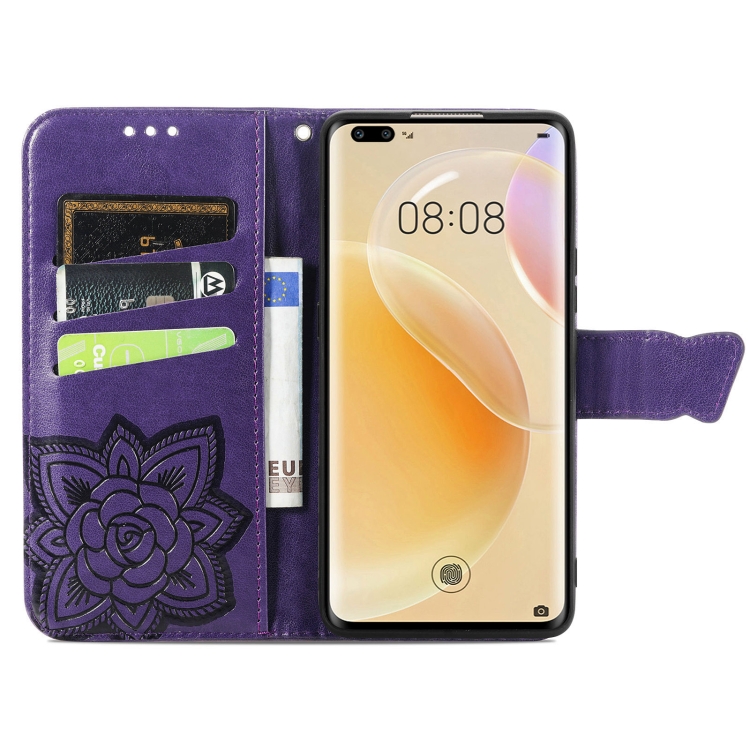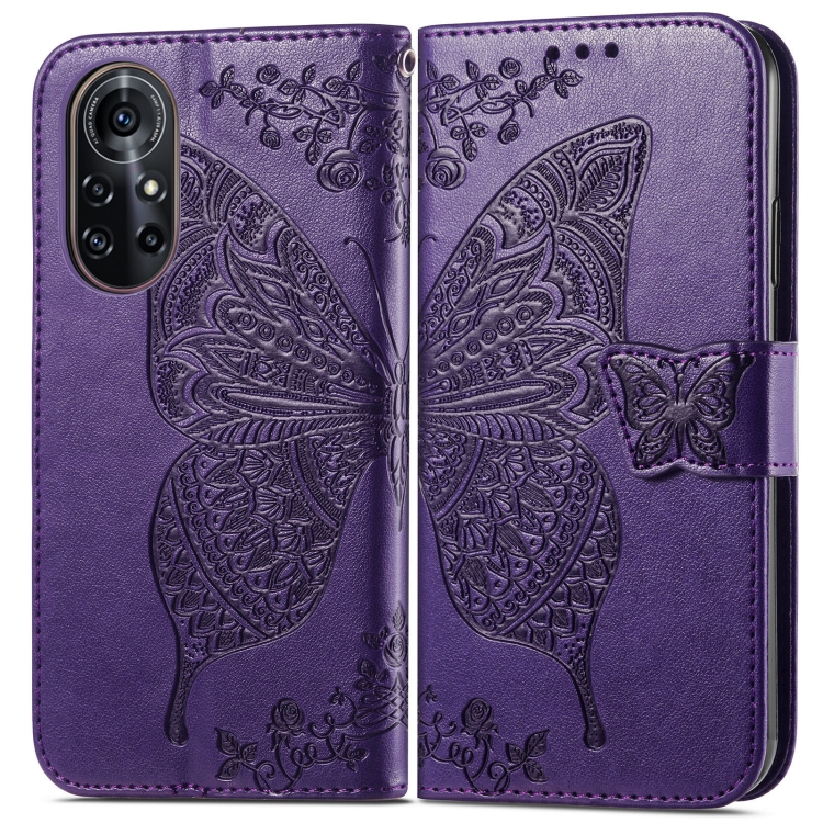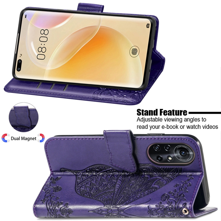 Para Huawei Nova 8 Pro Butterfly Love Flower Flower Horizontal Flip Funda de cuero con soporte y ranura para tarjeta y billetera y cordón (morado oscuro)
