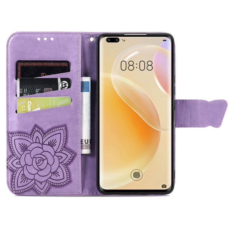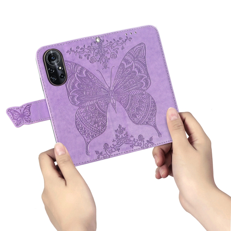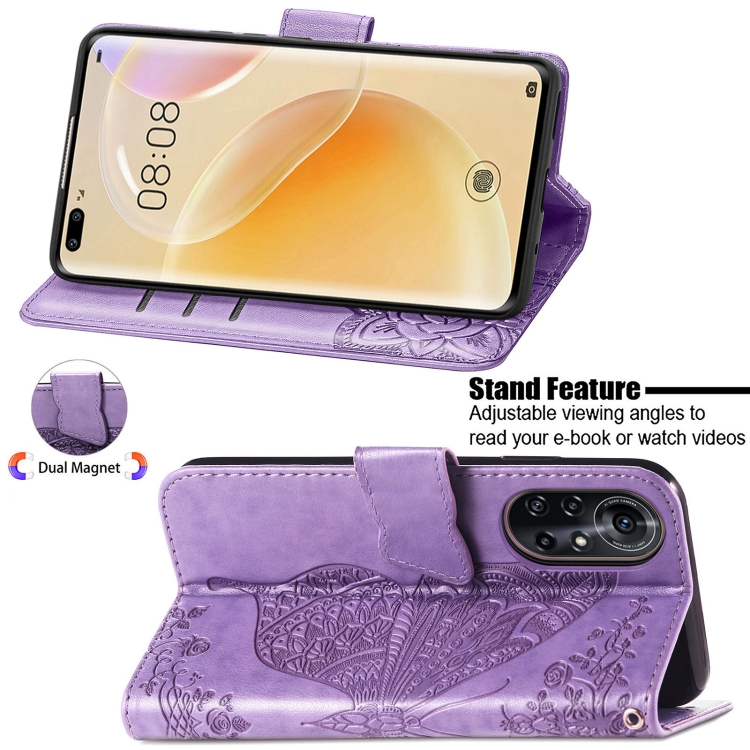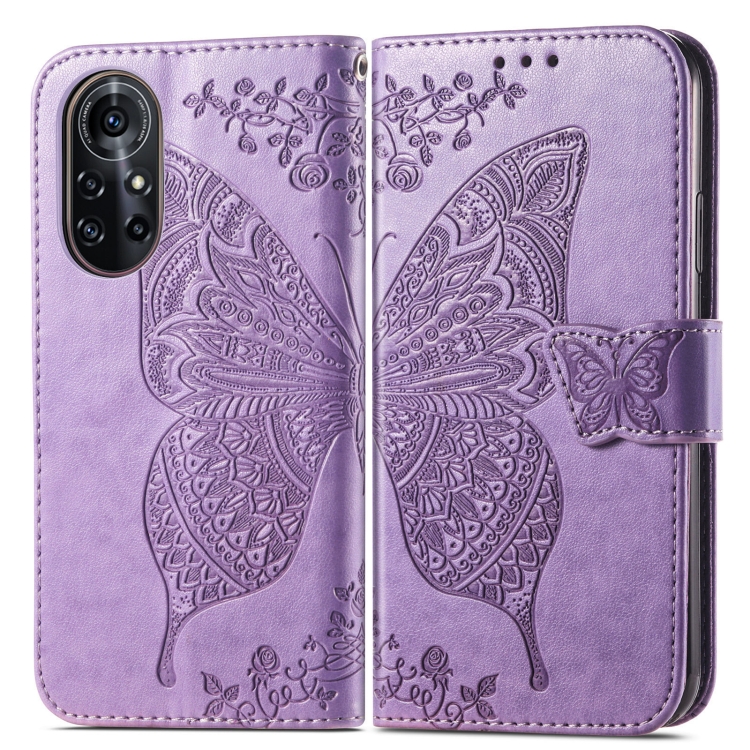 Para Huawei Nova 8 Pro Butterfly Love Flower Flower Horizontal Flip Funda de cuero con soporte y ranura para tarjeta y billetera y cordón (púrpura claro)