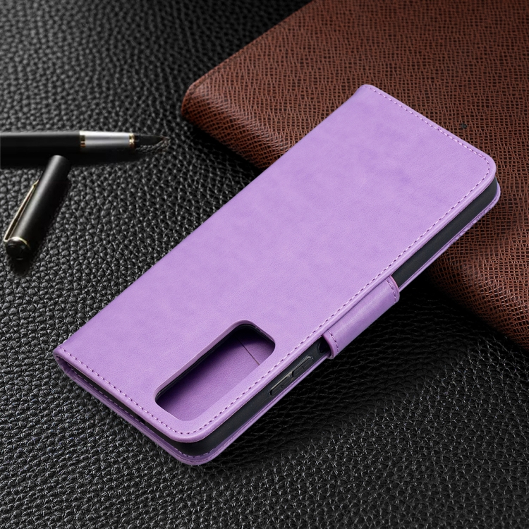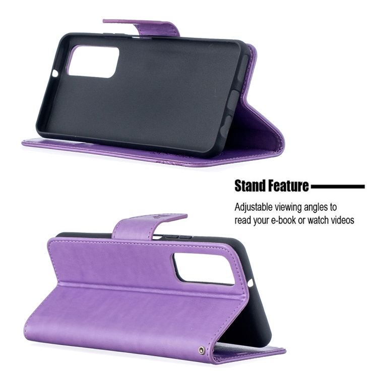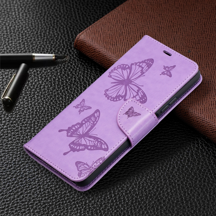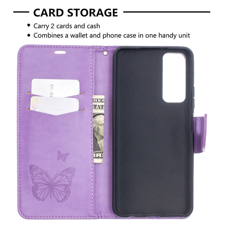 Para Huawei P Smart 2021 / Y7A Dos mariposas Patrón de estampado en relieve Funda de cuero de la tapa con soporte y tarjeta Slot & Wallet & Lanyard (púrpura)