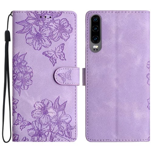 Funda para Huawei P30 Cherry Blossom Butterfly Skin Feel de PU en Relieve (Púrpura)