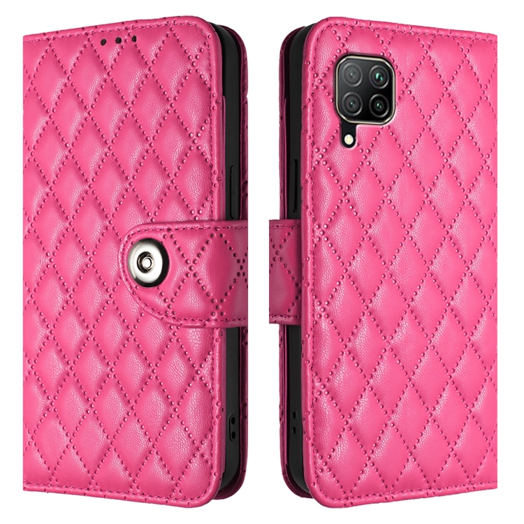 Funda para Huawei P40 Lite y Nova 6 Se con Tapa de Cuero Textura Rómbica y Cordón (Rojo Rosa)