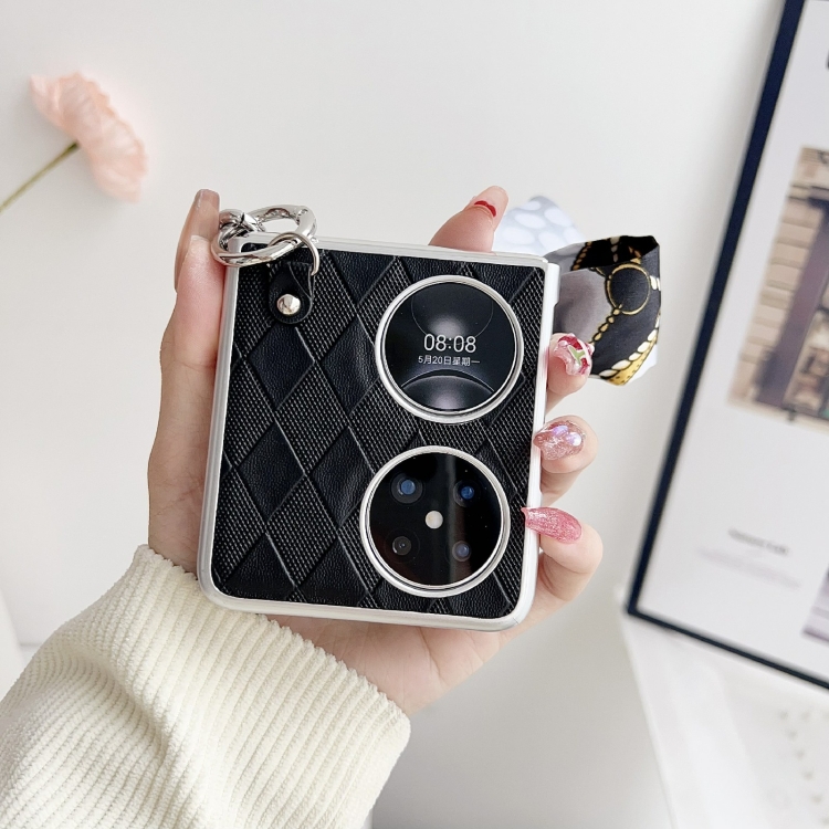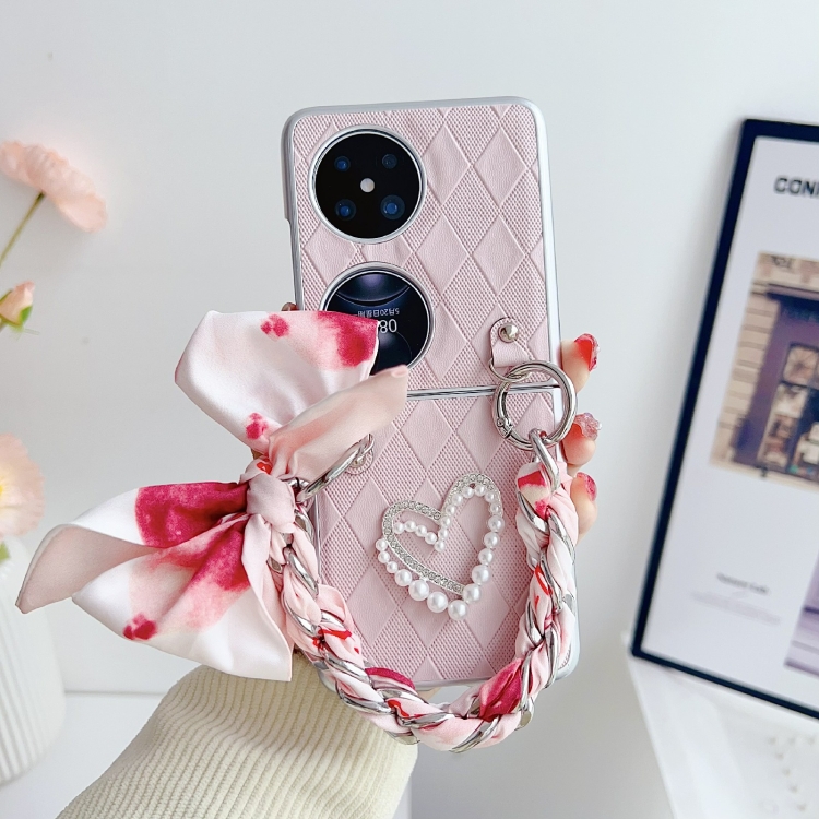 Funda para Huawei P50 Pocket con Textura de Cuero, Bufanda y Pulsera Corazón, Antigolpes (Rosa)