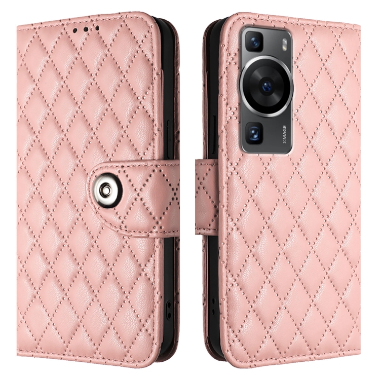 - 1x Funda de Cuero para Huawei P60 y P60 Pro con Tapa Textura Rómbica y Cordón (Rosa Coral)