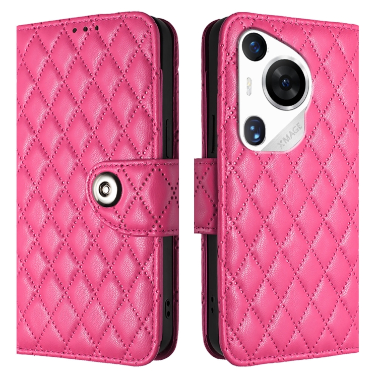 - 1x Funda de Cuero para Huawei Pura 70 Pro con Tapa Textura Rombal y Cordón (Rojo Rosa)