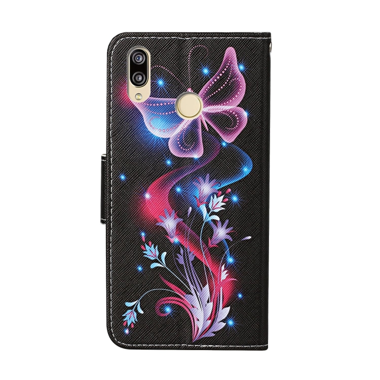 Estuche de Cuero Abatible Huawei Y7 (2019) con Soporte, Ranuras para Tarjetas y Billetera (Mariposa Fluorescente)