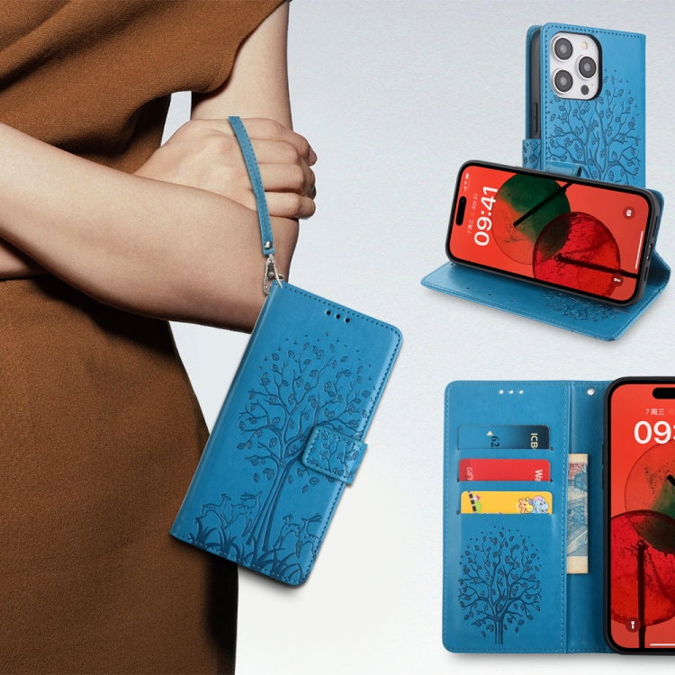 Funda de Cuero para Huawei Y9S con Relieve de Árbol y Ciervo (Azul)
