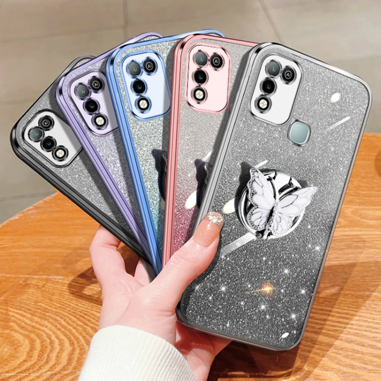 Funda para Infinix Hot 10 Play TPU con Soporte de Mariposa y Brillo Degradado (Plata)