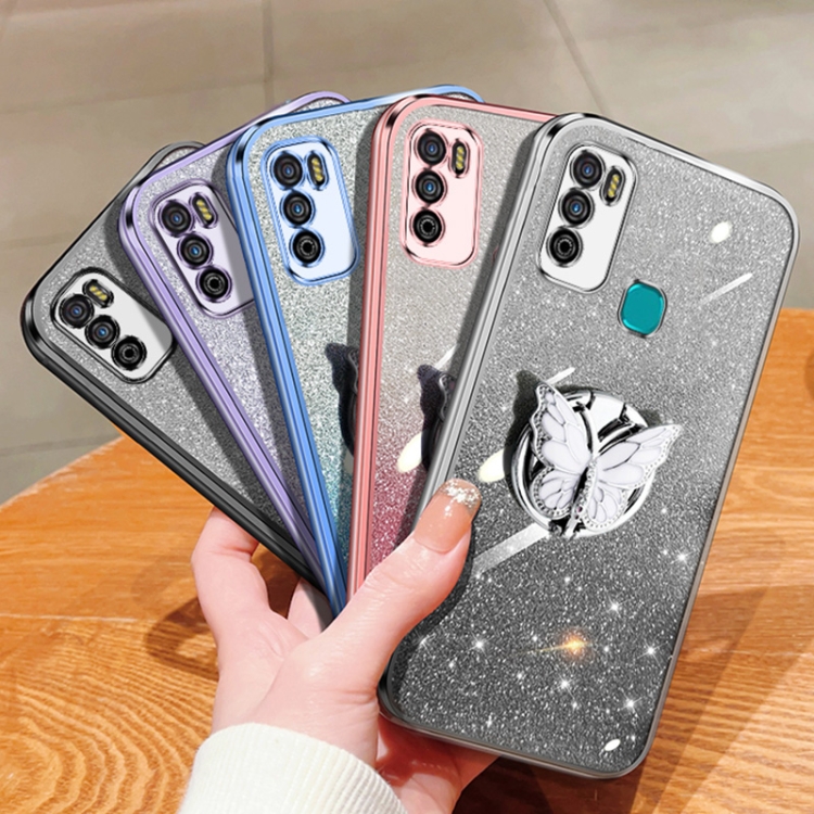 Estuche TPU para Infinix Hot 9 Play con Soporte Mariposa y Brillo Degradado (Púrpura)